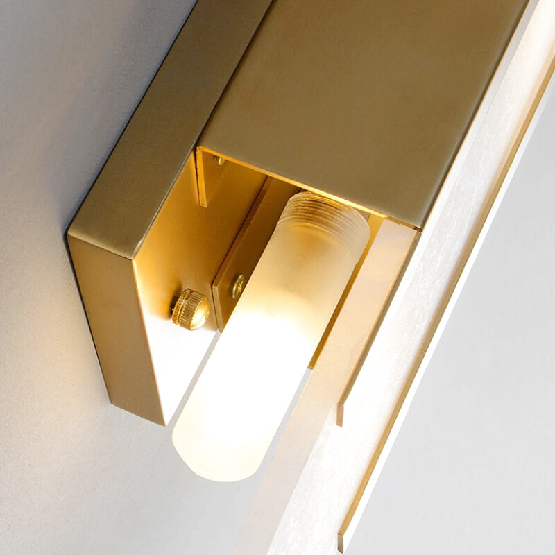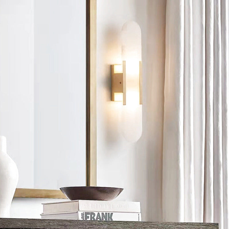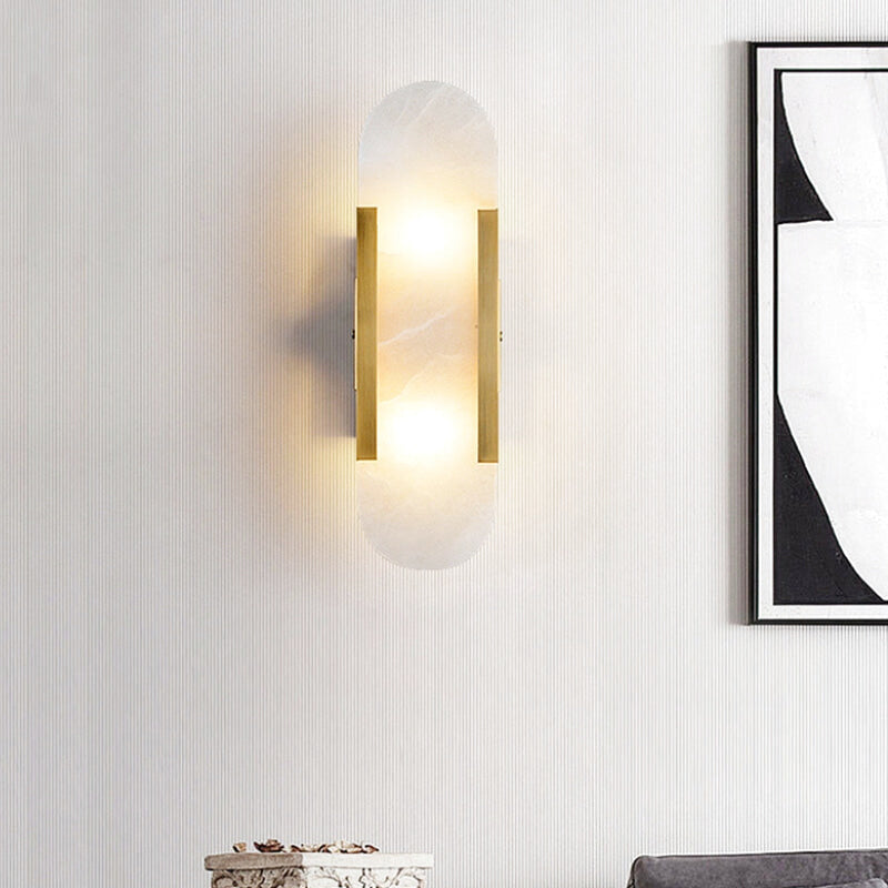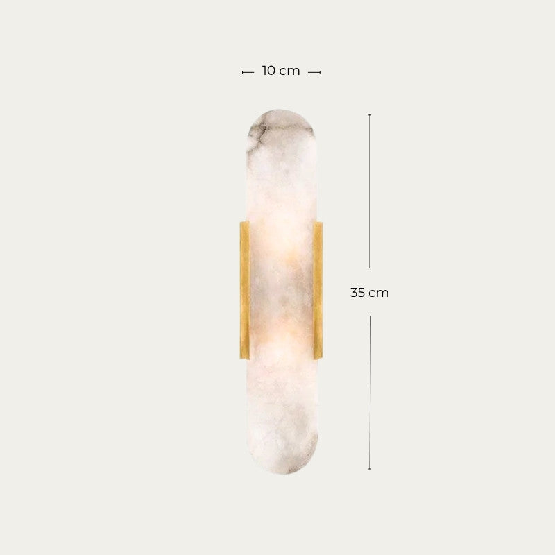 Équipée de deux bandes verticales en or mat encadrées par un écran ovale en albâtre, cette applique diffuse une lumière douce qui crée une atmosphère chaleureuse et apaisante. Elle est idéale pour ceux qui cherchent à combiner fonctionnalité et élégance.